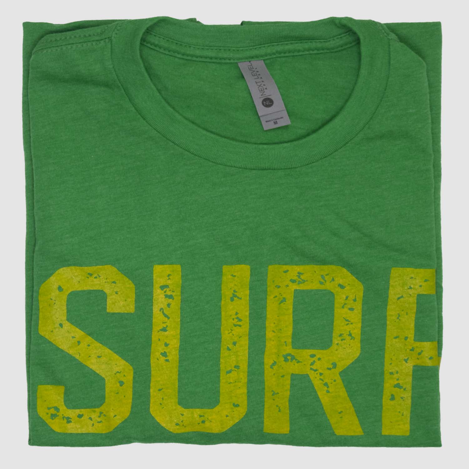 The original "Surf Wisconsin" men's T-shirt was made over ten years ago and now it's back....better than ever! Soft feel, green heathered premium men's T-shirt. In the traditional green and gold!