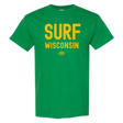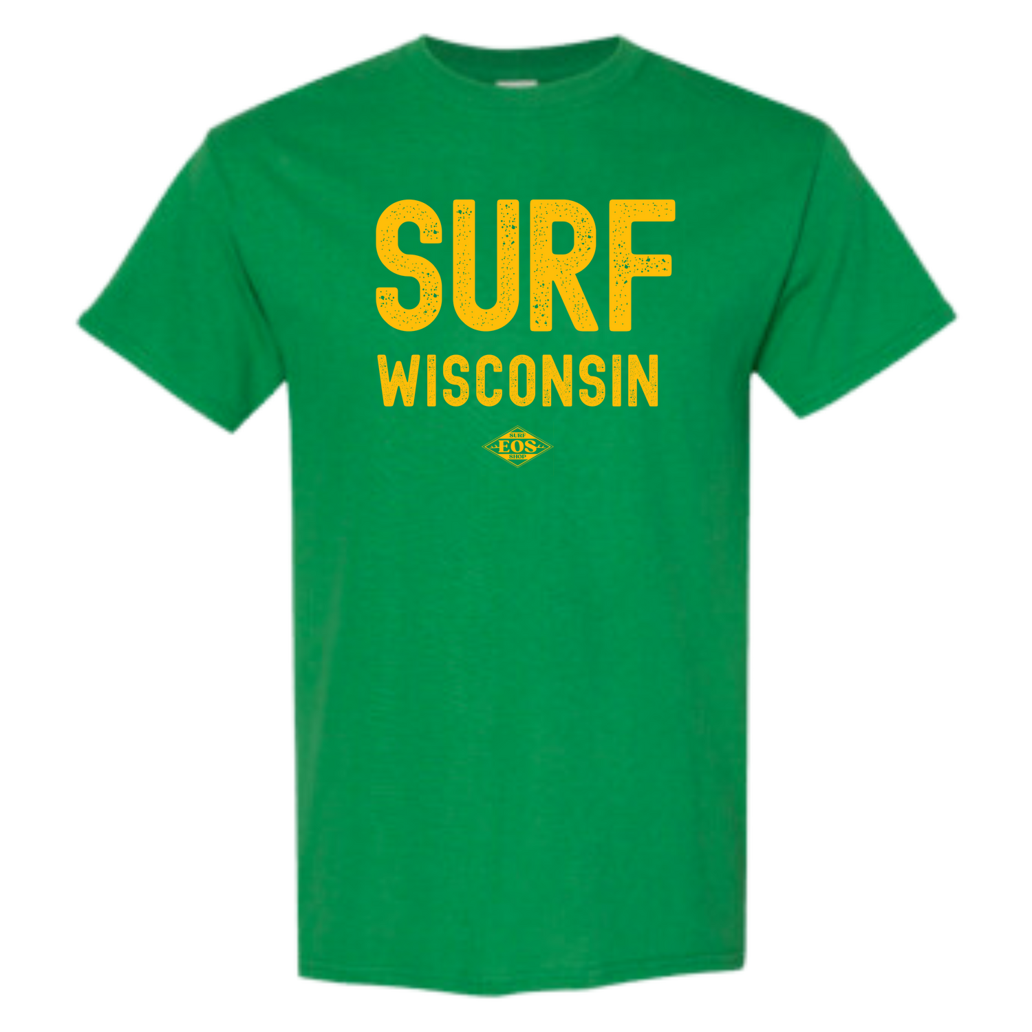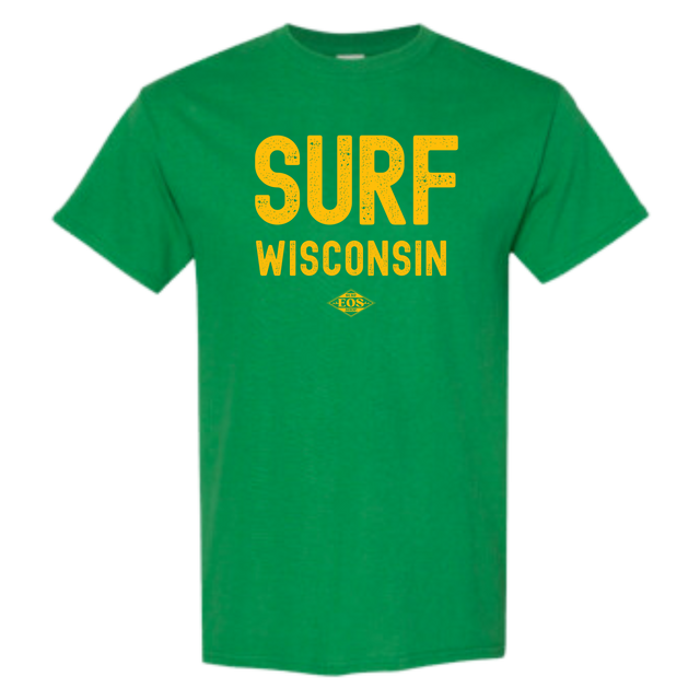 The original "Surf Wisconsin" men's T-shirt was made over ten years ago and now it's back....better than ever! Soft feel, green heathered premium men's T-shirt. In the traditional green and gold!