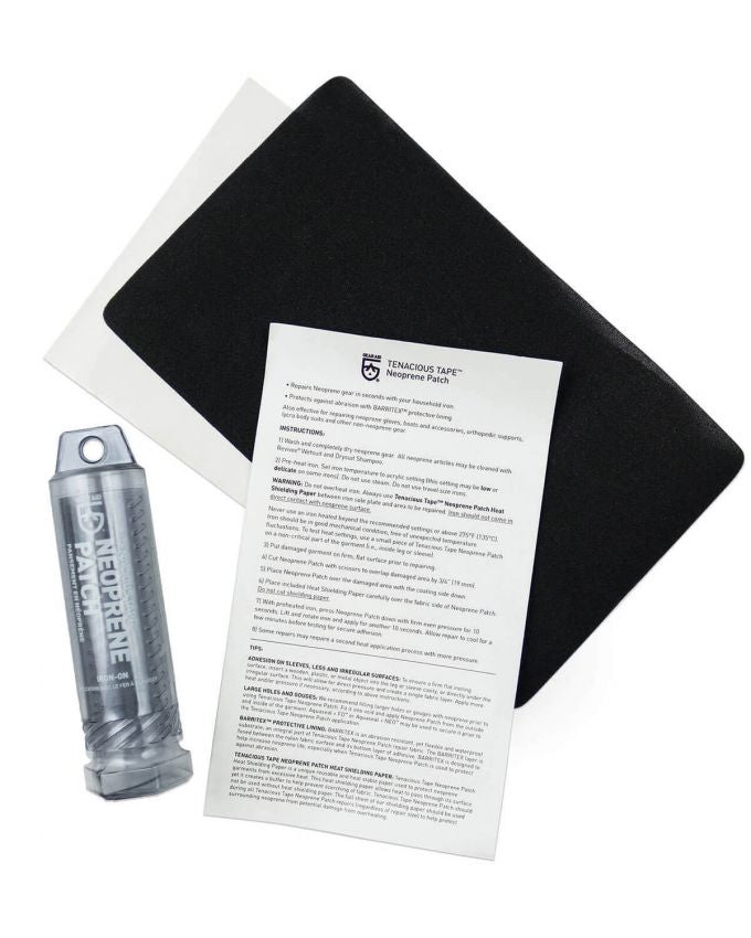 This patch kit allows you to fix rips, holes and tears on anything made of neoprene. Just cut the neoprene patch to fit, and use your household iron to create a permanent repair. It's also perfect for reinforcing high-wear areas, like elbows, knees and under arms.