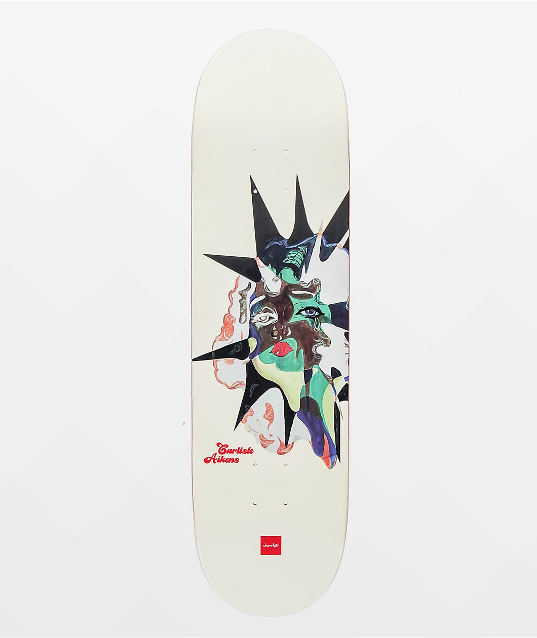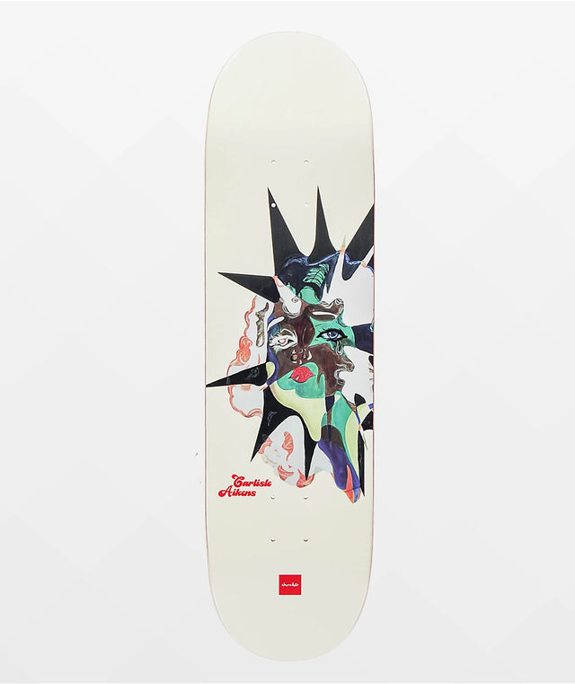The Carlisle Aikens L8rgirl pro model skateboard deck from Chocolate Skateboards measures at 8.5" wide and features a colorblocked, paint-style graphic of a woman's face.
